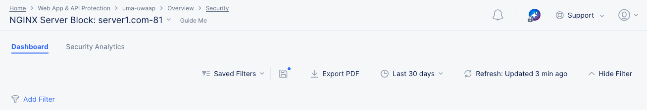At the top of the page, there are two tabs, Dashboard and Security Analytics, followed by some common options across all tabs.